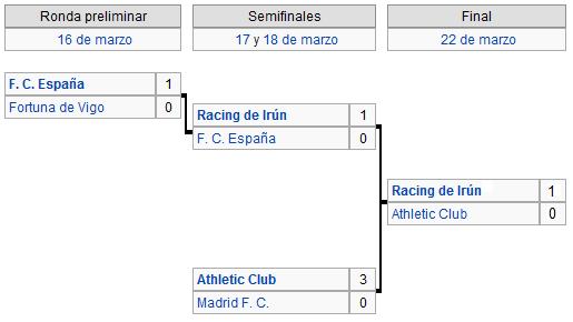 The semfinals were a Basque festival. In the first semifinal, Racing Irún defeated FC España (1-0) to get the ticket to the final. In the 2nd semifinal, a superior Athletic Club did not have problems (0-3) to beat the home team, Madrid FC.